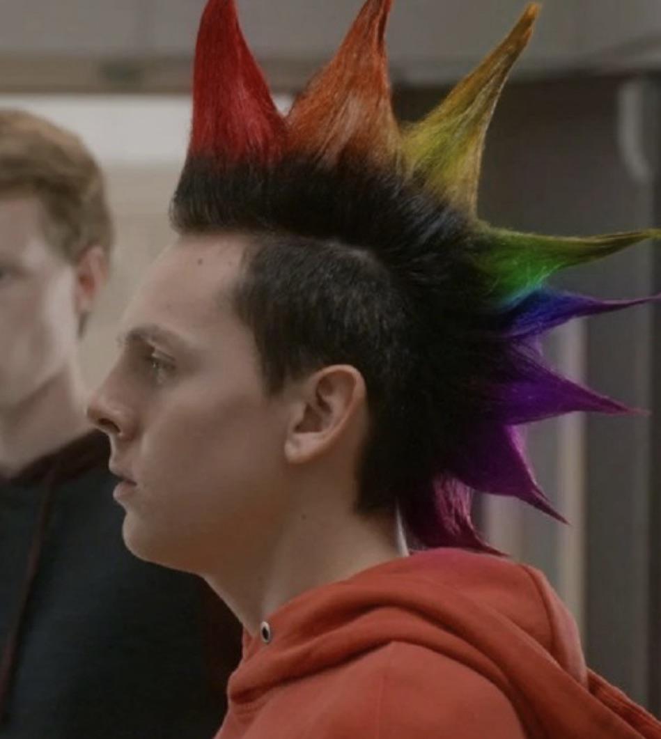 Now usually Jacob Bertrand's ACTUAL hair is styled into the mohawk but for Season 4 they are using a mohawk wig! Interesting... Credit to the Netflix Tik-Tok!